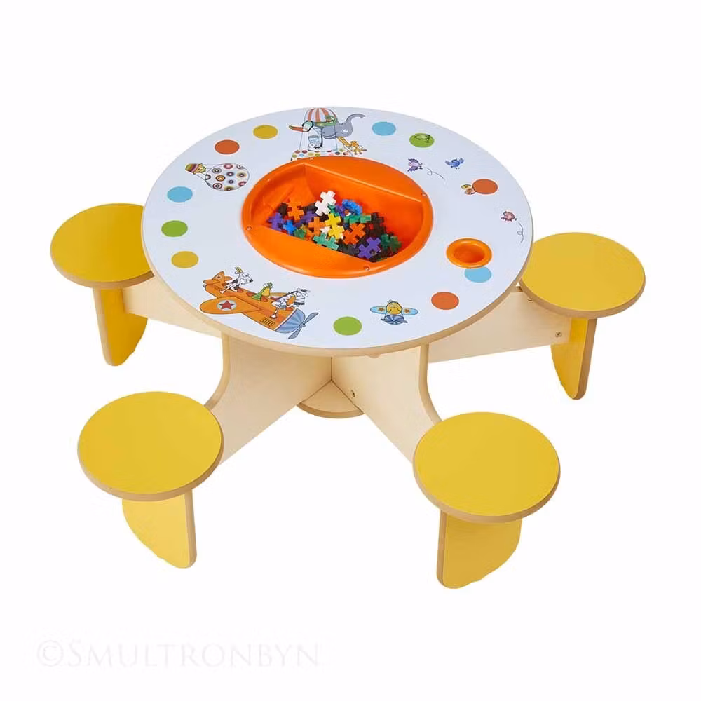 Click byggbitar medföljer bordet. I övrigt kan du själv fylla på bordet med färgpennor, lego, små djur och andra små leksaker.