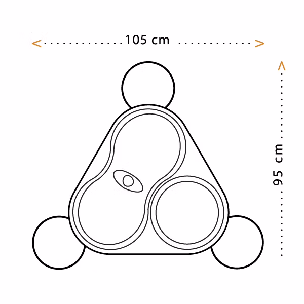 Trio aktivitetsbord består av tre sittplatser och bord sammansatt i ett. Barnen sitter bekvämt grensle över sittplatsen. På bordet finns dels ett sällskapsspel för två barn samt en svängbar kulbana framför den tredje sittplatsen.