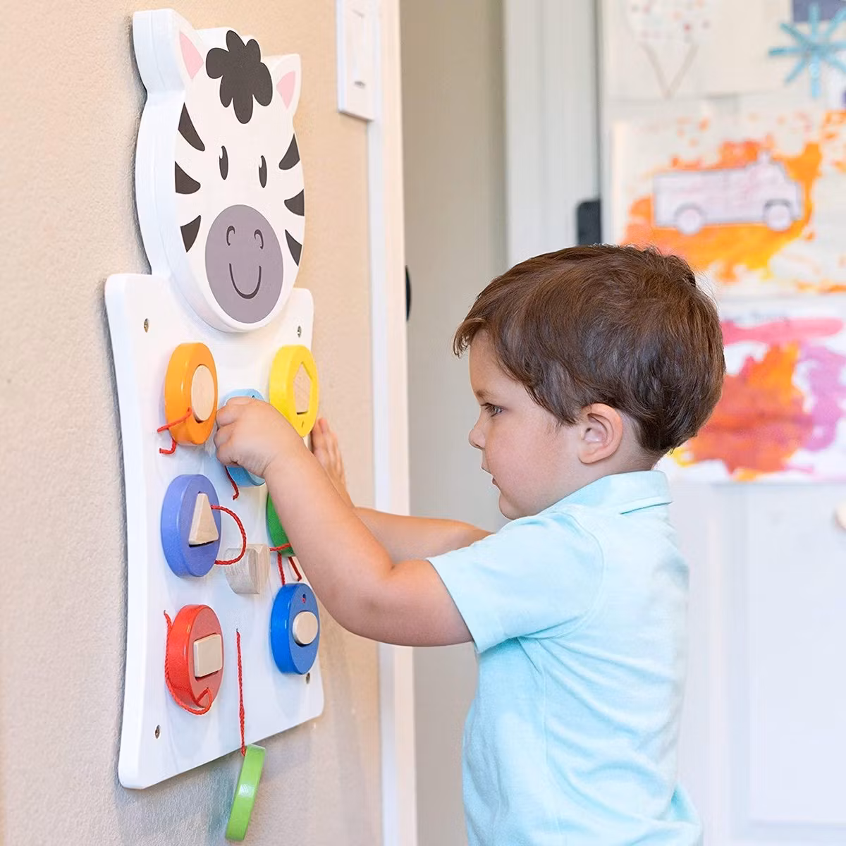 Zebran har ett geometriskt pussel på magen där klossar ska placeras in i rätt form.