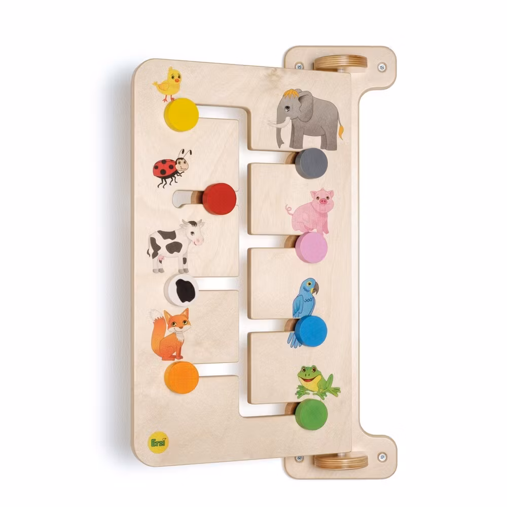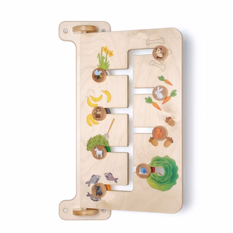 Varje sida har åtta djur som ska matchas med antingen maten de äter eller färgen på djuret. Detta görs genom att dra de runda träbitarna i spåren.