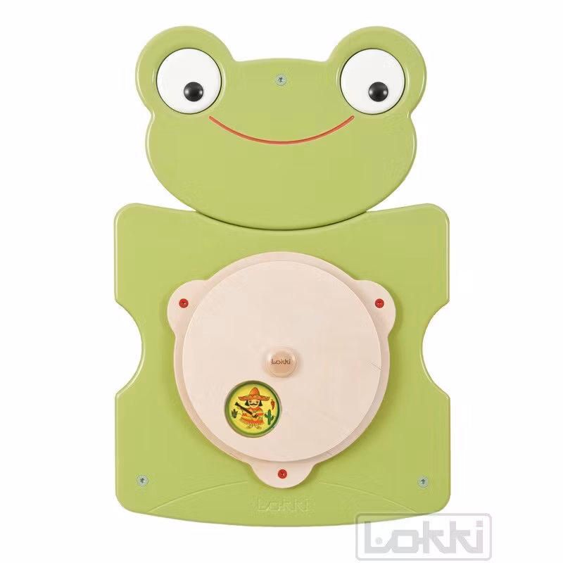 Fred Groda väggpanel har en rund platta med ett cirkelformat hål. Barnen kan snurra runt plattan och upptäcka olika illustrationer genom kikhålet.