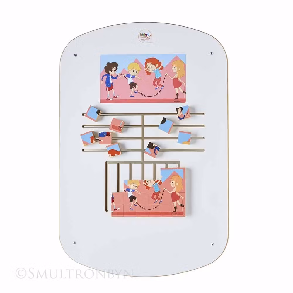 En aktivitetspanel med fyra barn som hoppar hopprep. Låt barnen dra bitarna på rätt plats och få ihop pusslet mot den vita bakgrund. En utmaning som kräver lite eftertanke eftersom bitarna måste dras i rätt ordning för att få figuren rätt.