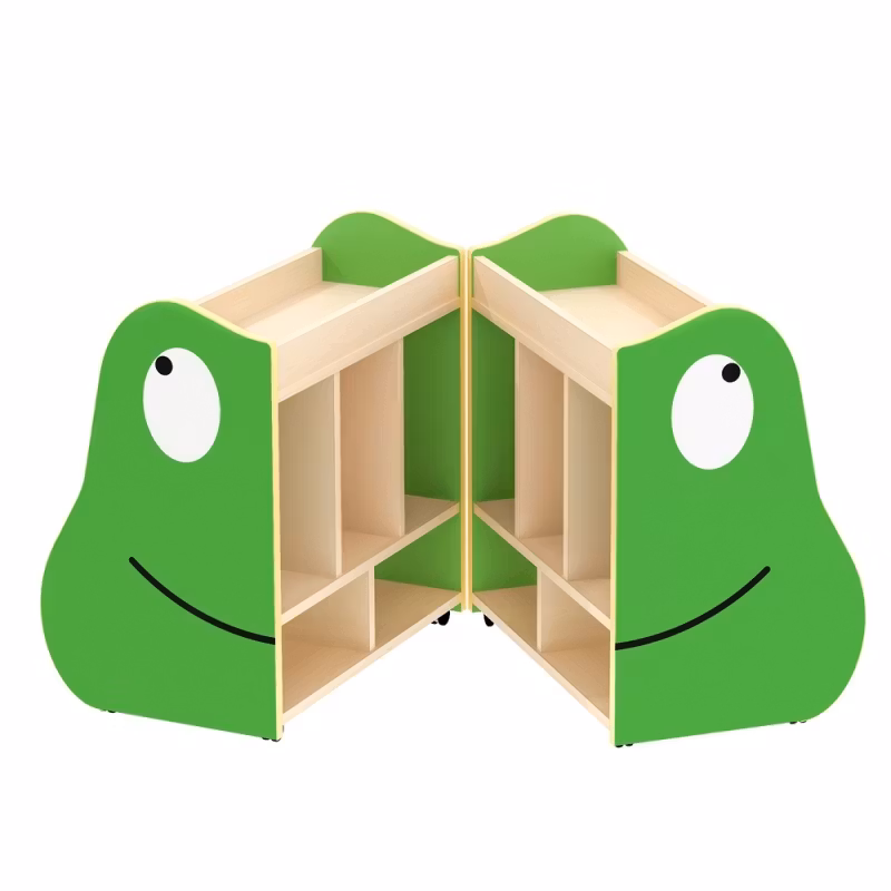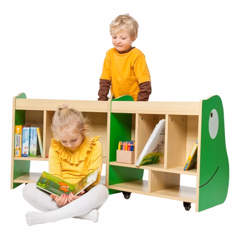 Två små lekfulla bokhyllor med många förvaringsfack.