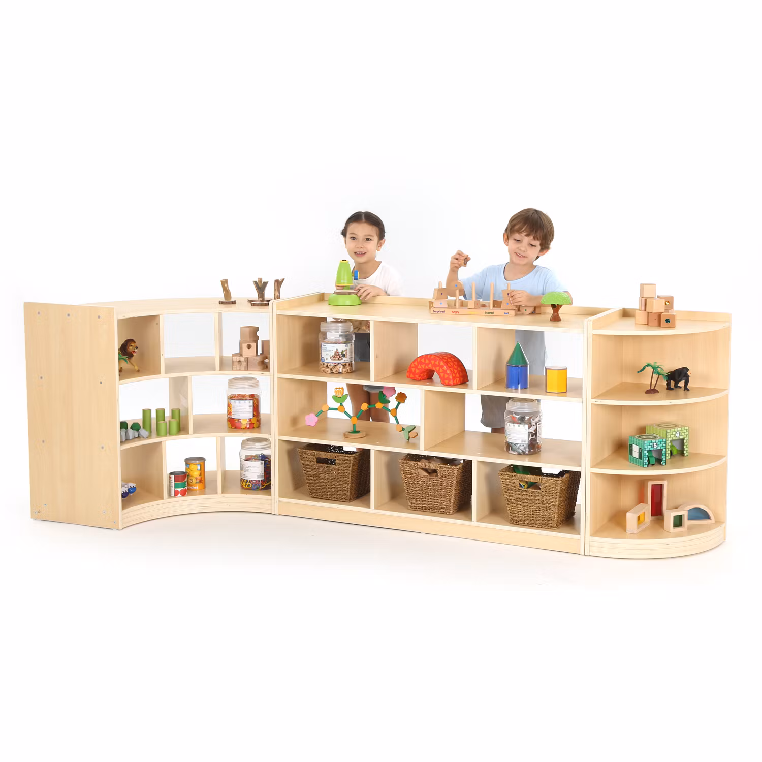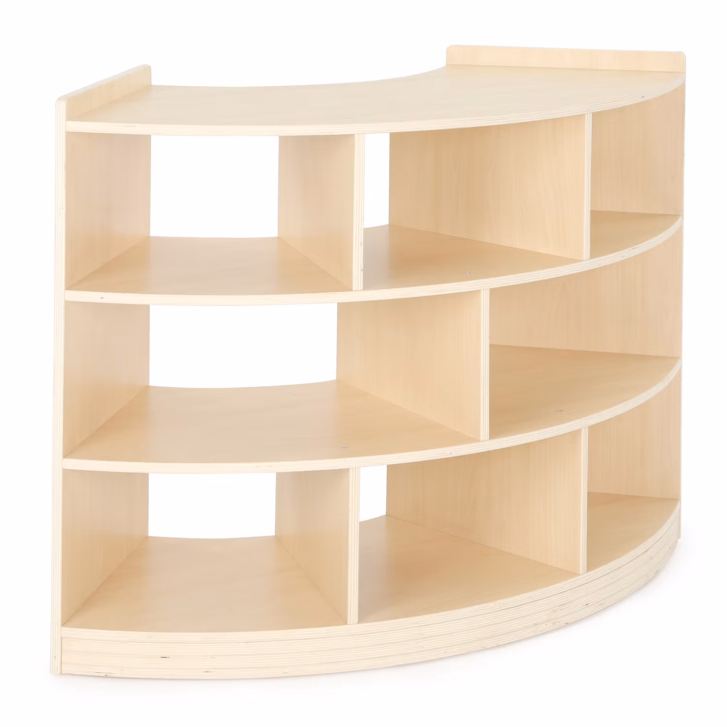 En svängd trähylla med fyra hyllplan (åtta fack) i möbelserien Owlaf.