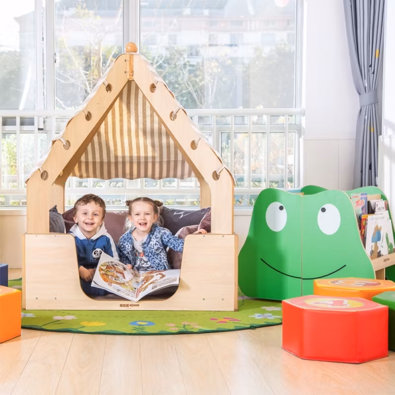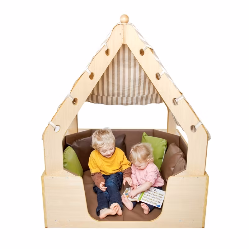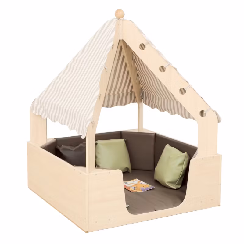 Kojan har en fyrkantig form med tälttak. En formad sittdyna med uppvikta kanter medföljer.