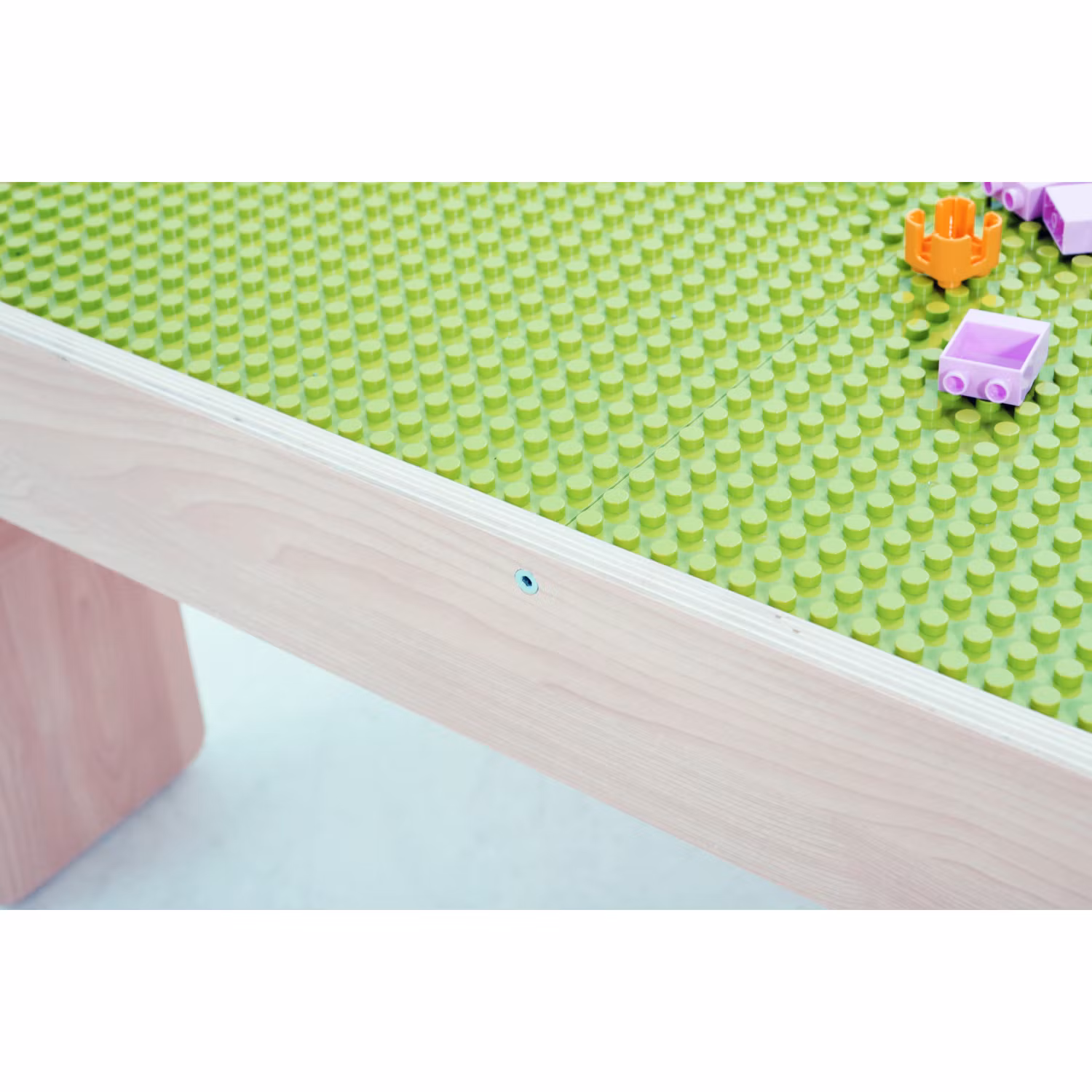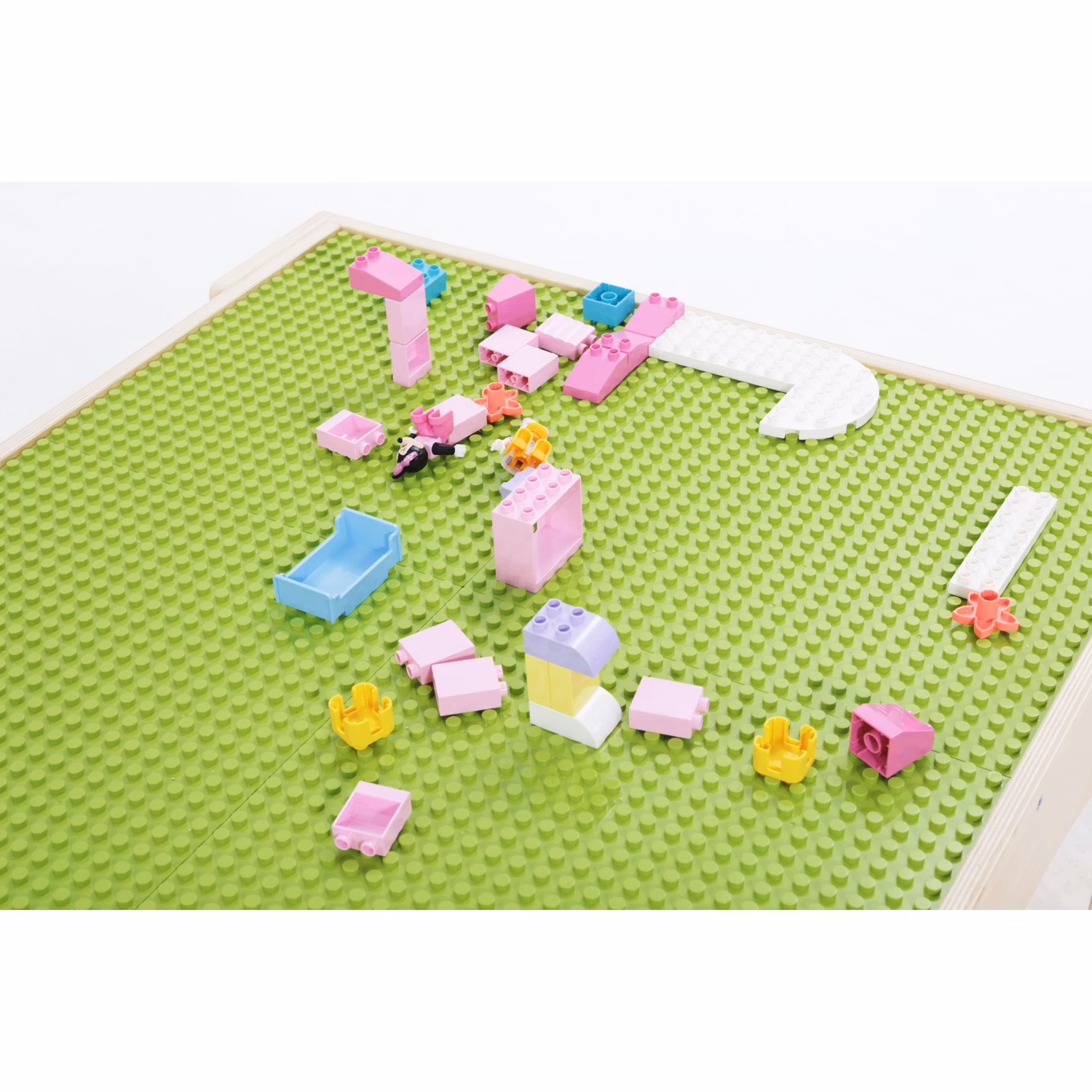 Bordsytan är täckt med fyra sammanfogade byggplattor där barnen kan bygga upp en liten fantasivärld med hus, torn och andra fantasifulla skapelser.