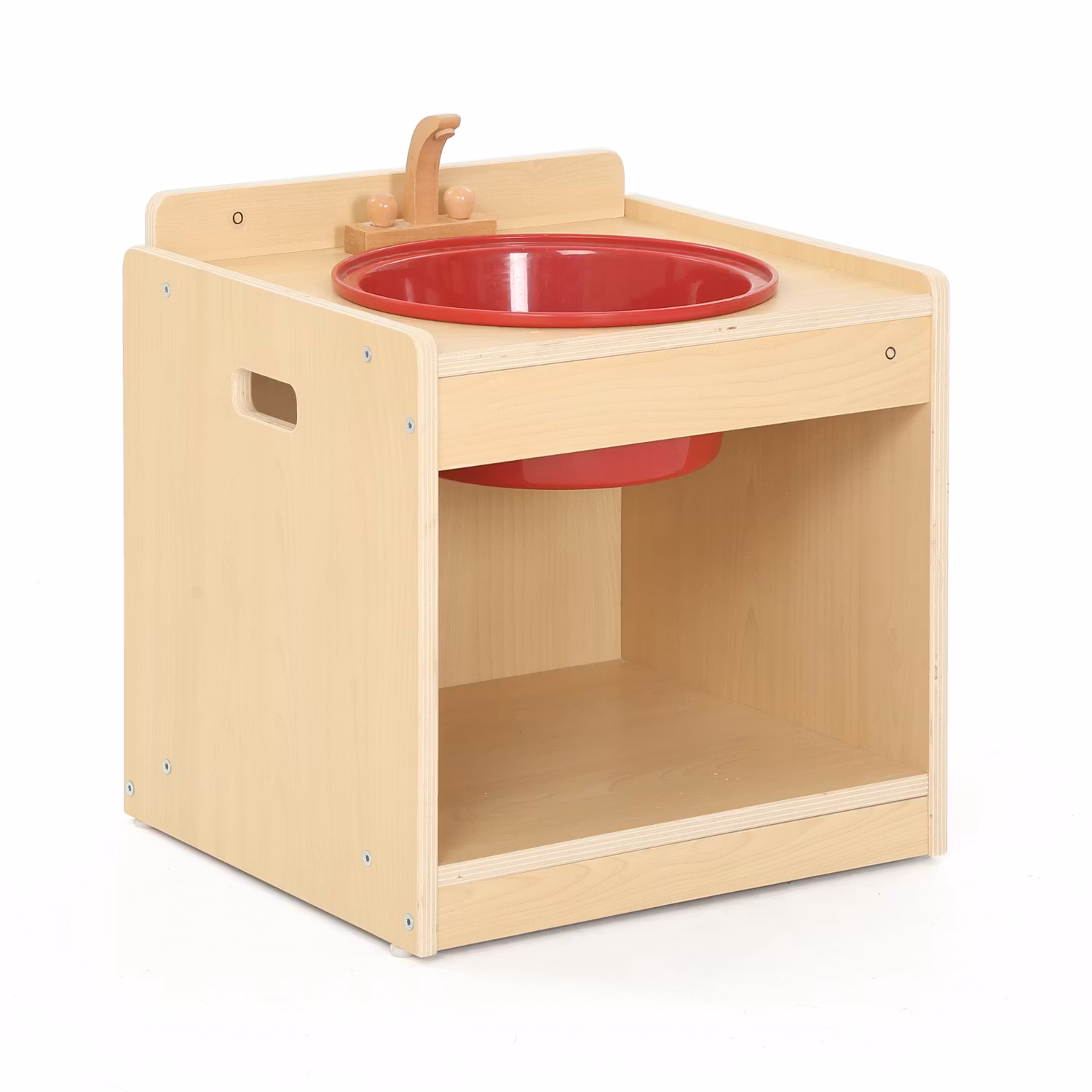Skåp tillverkat i plywood med melaminlönnfanér. Handfat i plast (PP).