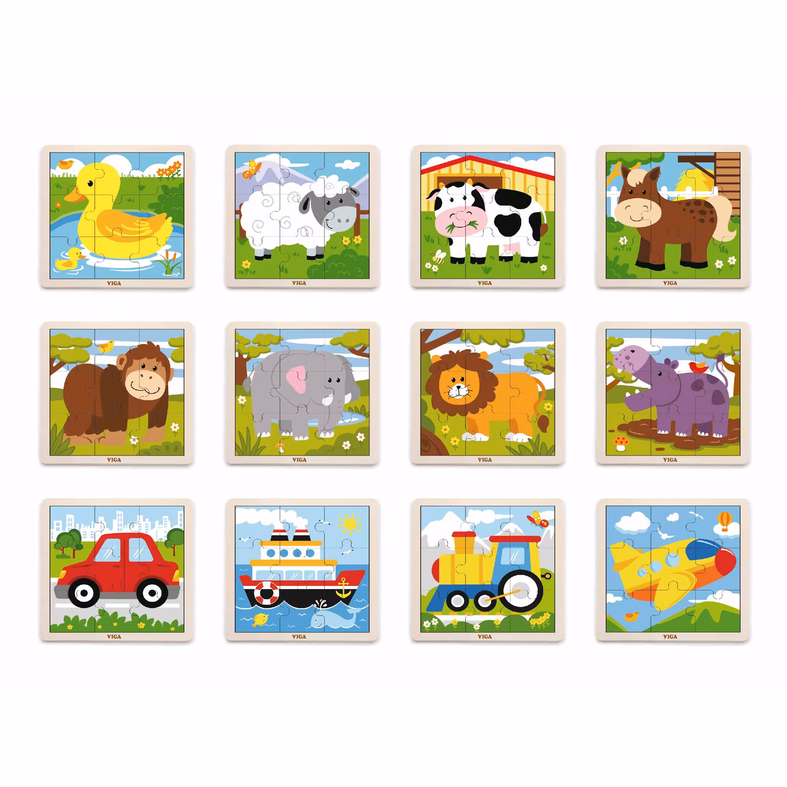Motiven på pusslen består av fyra bondgårdsdjur, fyra djungeldjur och fyra fordon.