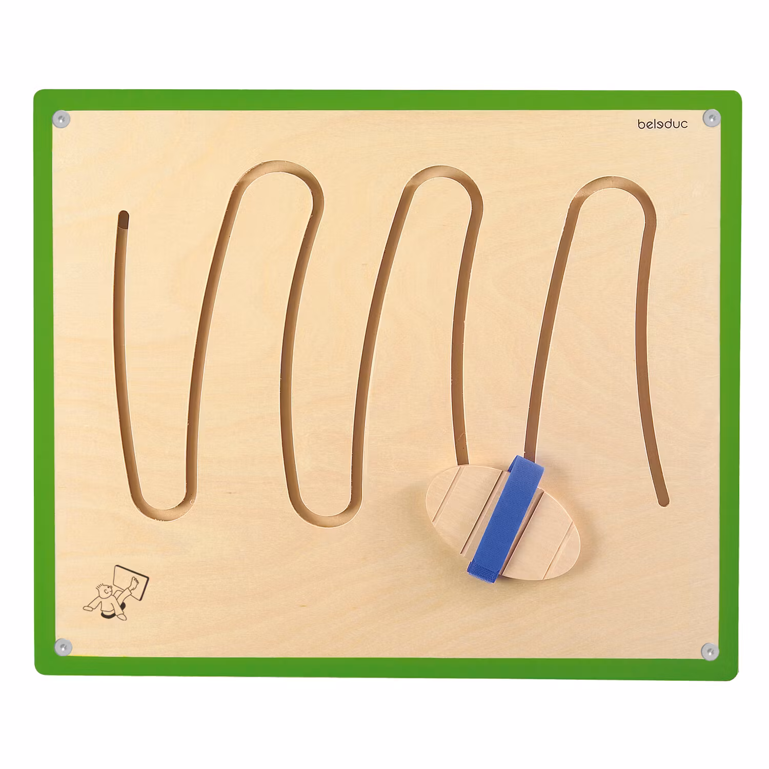 Väggpanelen fästs nära golvnivå. Barnen sitter på golvet framför brädan och trär foten i träklossens bindning. Därefter styr de genom labyrinten med foten.
