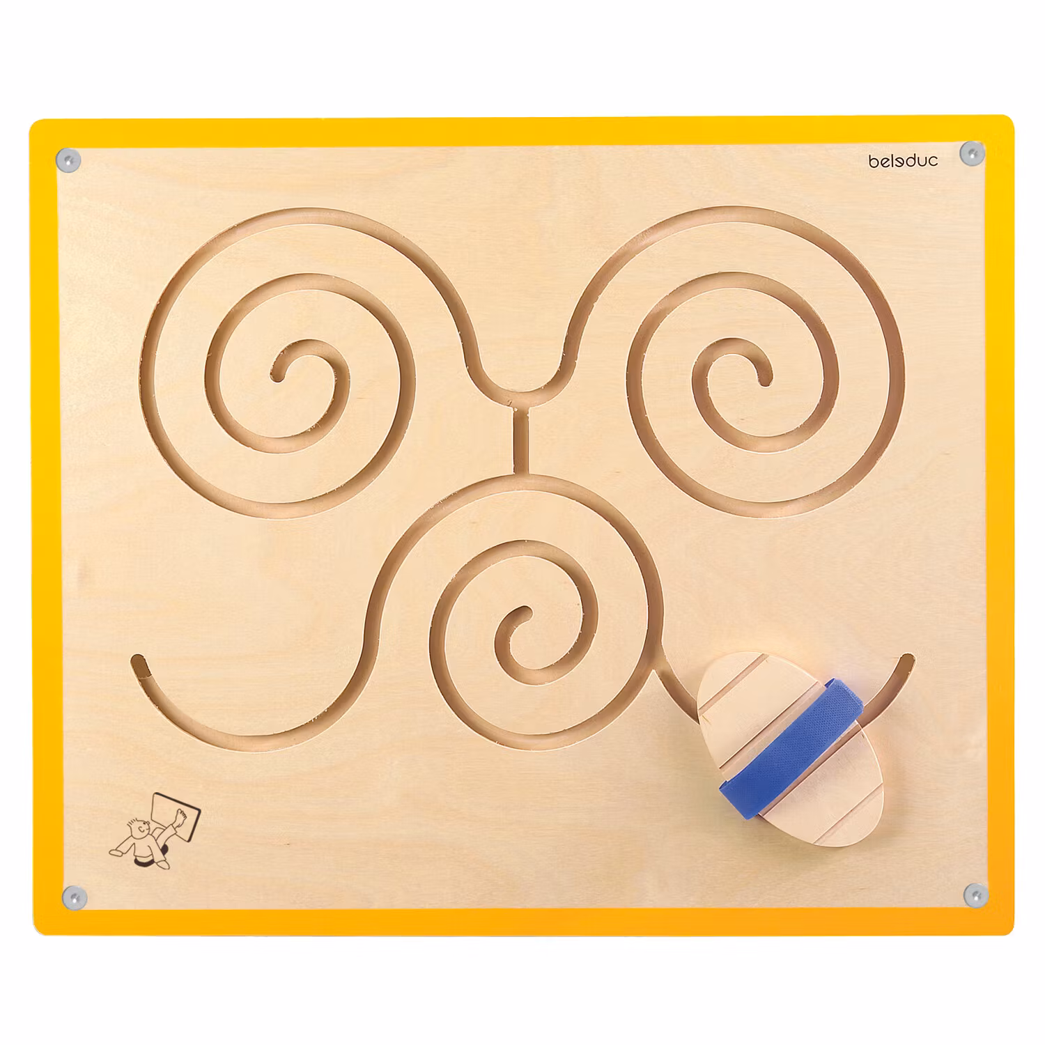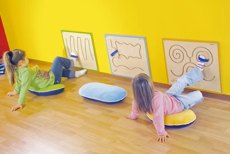 Väggpanelen fästs nära golvnivå. Barnen sitter på golvet framför brädan och trär foten i träklossens bindning. Därefter styr de genom labyrinten med foten.
