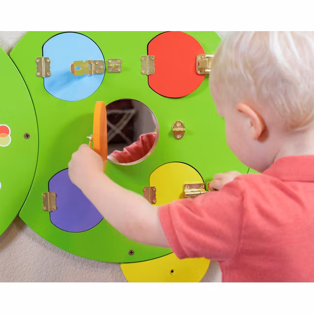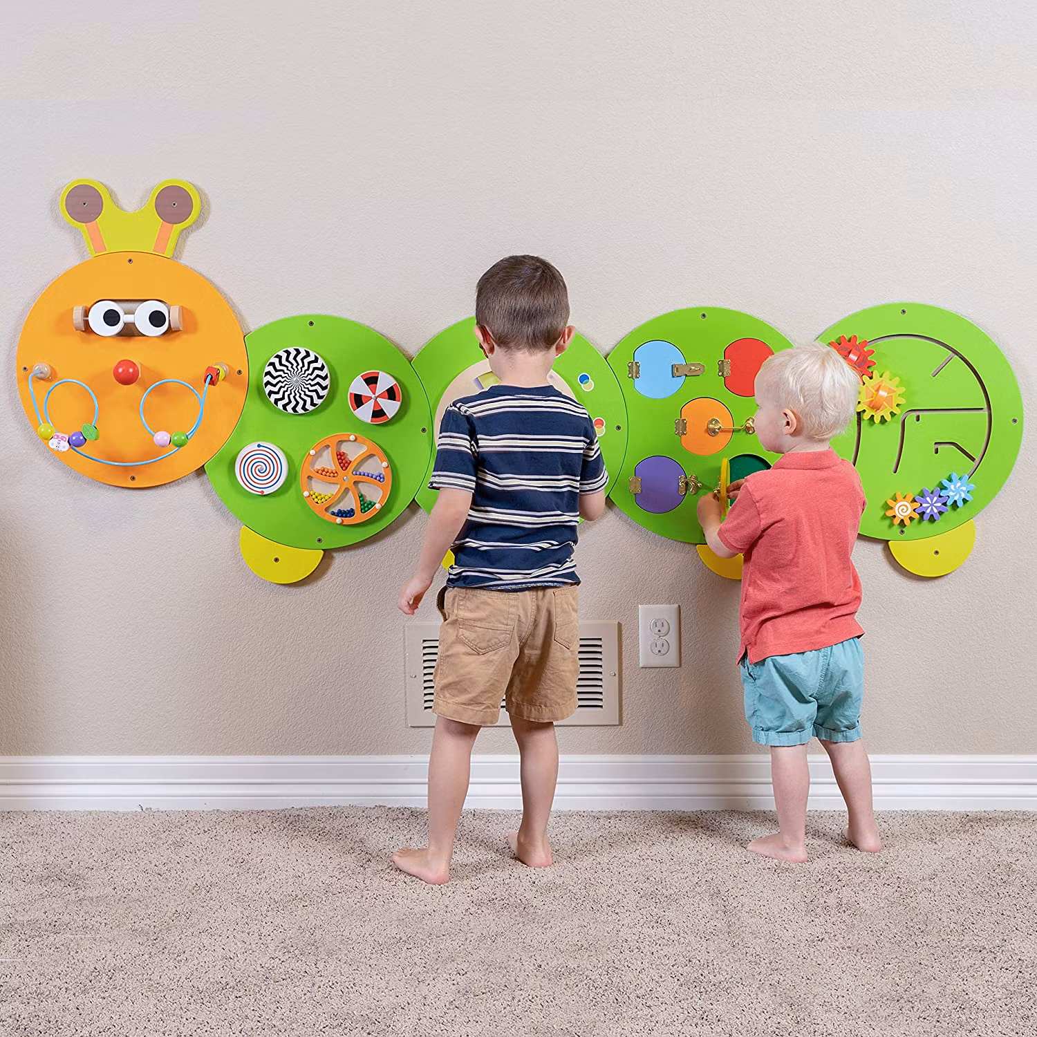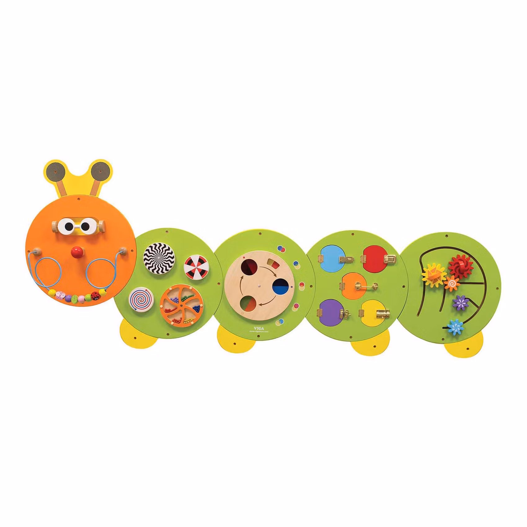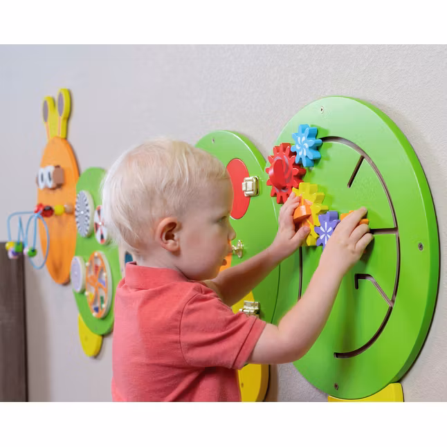 Den här larvformade aktivitetstavlan är uppdelad i fem sektioner och så stor att flera barn enkelt kan leka med den samtidigt – antingen bredvid varandra eller tillsammans.