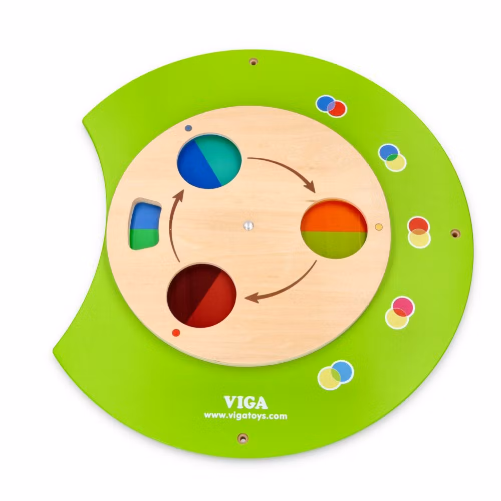 - På den tredje sektionen visar ett färghjul hur olika kombinationer av de tre primärfärgerna (röd, gul och blå) bildar nya färger.