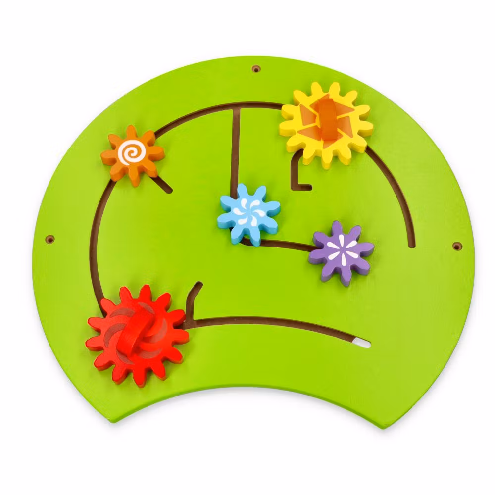 - Den sista sektionen är ett kugghjulspussel där barnen kan flytta tre kugghjul längs labyrinten med hjälp av sina händer och de två fasta kugghjulen som snurras med handtaget.