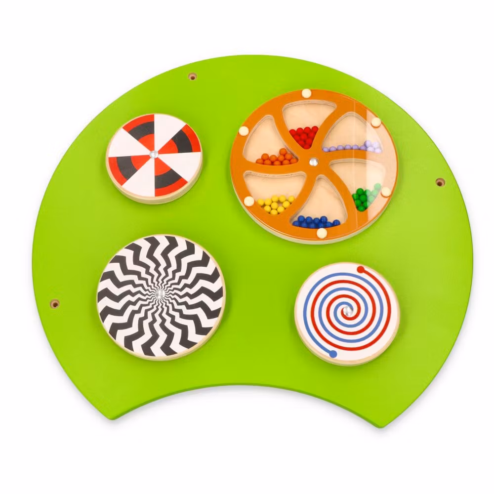 - Den andra sektionen har fyra snurrskivor, tre med visuella effekter och den fjärde med pärlor som skapar ljud då den snurras.